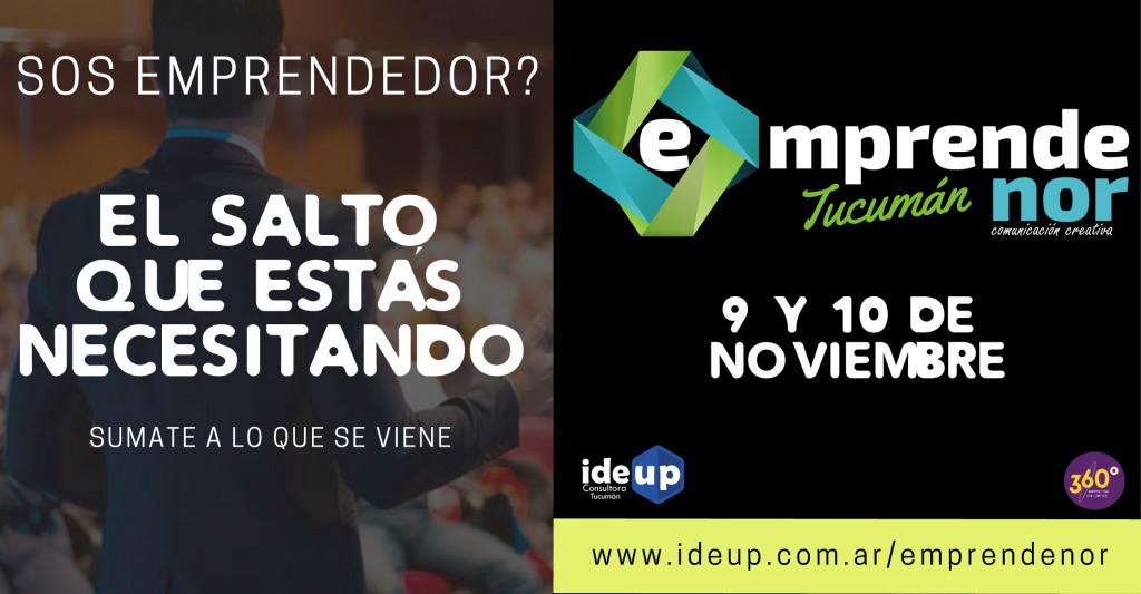 En momentos de CRISIS contar con las herramientas adecuadas te potencian, por eso Ideup Consultora Tucuman, (@ideup.consultora) y Marketing 360, llevarán a cabo el Primer Encuentro de Capacitación Intensiva para Emprendedores de Tucumán, para que todos aquellos que son emprendedores o que quieran serlo y ya tengan una idea en mente puedan capacitarse sobre herramientas fundamentales a la hora de comenzar un nuevo proyecto o bien mejorar el ya existente. El día 9 de Noviembre el temario será PNL aplicada a emprendimientos, o mejor dicho, Programación Neurolingüísta aplicada a emprendimientos. Se trabajará sobre herramientas y técnicas específicas para potenciar tu emprendimiento. Podrás detectar cuales son aquellas cuestiones que no permiten crecer o desarrollar tu idea. Aprenderás a aplicar la Programación Neurolingüísta para hacer crecer tu proyecto y que dé sus frutos.   Parte del temario: *Descubre que es la PNL y los principios fundamentales para entenderla y utilizarla. *Desarrolla técnicas y metodologías para poder aplicarla en tu emprendimiento y obtener excelentes resultados. *Desarrolla tu propio plan estratégico utilizando lo aprendido y llevate todos los conocimientos para hacer crecer tu negocio. El día 9 de Noviembre el temario será Redes Sociales para Emprendedores. Hace crecer tu emprendimiento de un modo eficaz y duradero en el tiempo, ese es el principal objetivo, pero en este caso, usando las redes sociales como herramienta. Descubrirás las oportunidades que te ofrecen las redes sociales para ponerte en contacto con potenciales clientes de tu negocio, como mejorar, como conseguir nuevos clientes, como visualizar si lo que estás haciendo en las redes es correcto o no. Parte del temario: *Aprende como utilizar las redes sociales para que tu proyecto tenga mayor alcance y mejores tus ventas significativamente. *Aprende cuales son las principales herramientas de medición en Redes Sociales y como utilizarlas a tu favor. *Descubre como preparar tu propia estrategia de marketing, seguimiento y control de las acciones en Redes Sociales. De la Mano de Ideup Consultora, Leonardo Beznec, Comunicador, Coach y Locutor Nacional, y Marketing 360, Fabricio Villecco, Licenciado en Marketing y Juan Roggia, Community manager, llega a Tucumán “EmprendeNor”, para capacitarte y estar preparado.   El encuentro contara también con emprendedores y casos de éxitos además de otros disertantes. Para poder inscribirte debes ingresar a la web www.ideup.comn.ar/emprendenor y allí encontrarás toda la info y podrás adquirir tu entrada a través de Mercado Pago, con Tarjeta de Crédito, con Pago Fácil, Rapi Pago, Cobro Express, Red Link, etc. Sino podes adquirirlas personalmete en Compania de Marcas Outlet, en 25 de Mayo 492 o bien en, TuEvento, en General paz 810 Busca toda la info en www.ideup.comn.ar/emprendenor o bien en las Redes Sociales @emprendenor.tuc o @ideup.consultora