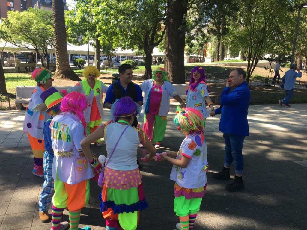 Integrantes de la Fundación Payaterapeutas estuvieron esta mañana en plaza Independencia con el objetivo de recaudar fondos para viajar a un encuentro de payasos hospitalarios en la ciudad de Córdoba.