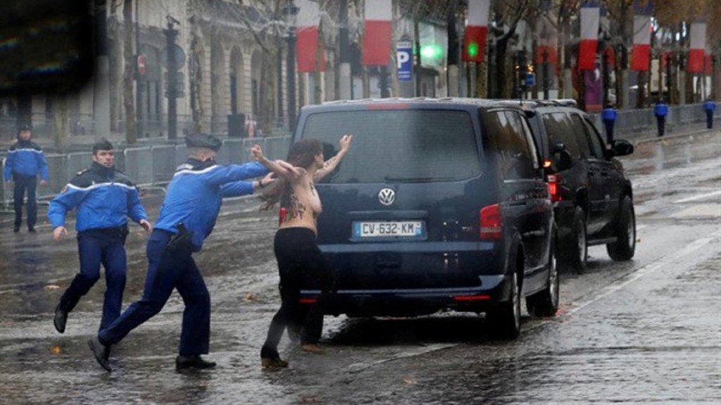 Una activista del del colectivo Femen fue detenida este domingo en París cuando intentó aproximarse en topless a la caravana que trasladaba al presidente de Estados Unidos, Donald Trump, quien estaba en camino a la ceremonia del centenario del Armisticio de la Primera Guera Mundial.