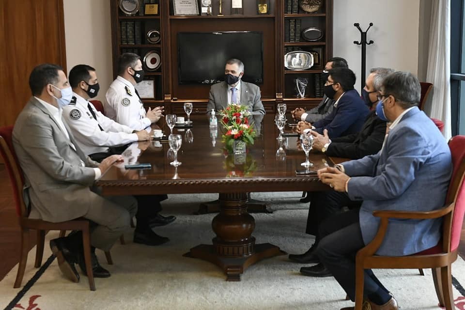 El vicegobernador, a cargo del Poder Ejecutivo, Osvaldo Jaldo, y el presidente subrogante de la Legislatura, Regino Amado, a cargo de la Vicegobernación, recibieron al Comisionado Ariel Castrichini, jefe regional 3 del Norte de la PSA, y al jefe de División Operaciones, Gastón Sosa, para conocer el trabajo que realiza la fuerza nacional en la provincia.