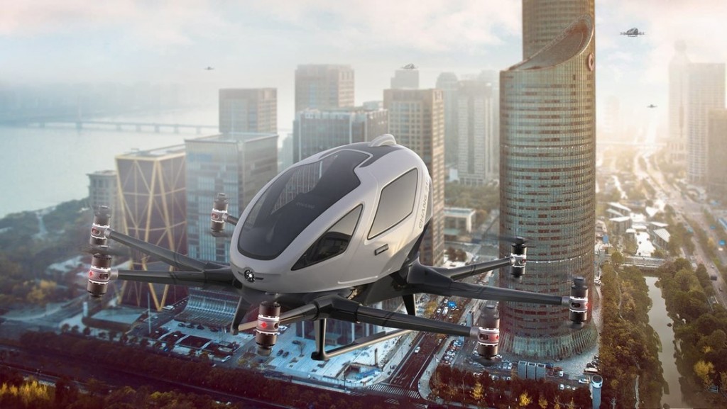 Los vehículos voladores de modelo EH216s son fabricados por la empresa china Ehang, cuentan con dos asientos y pesan 650 kilogramos cada uno