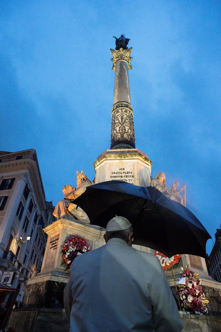 Aunque el Vaticano había dicho que el líder católico no acudiría al tradicional homenaje, minutos antes del amanecer estuvo allí para orar frente a la estatua bajo una intensa lluvia