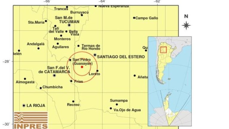 De acuerdo con este organismo dependiente del Ministerio de Obras Públicas, el temblor tuvo su epicentro a 64 kilómetros al sudoeste de la capital santiagueña, cerca de la localidad de San Pedro de Guasayán, y presentó una profundidad de 29 kilómetros.