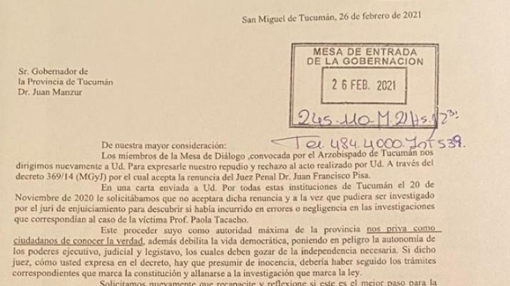 Este viernes 26 de febrero la Mesa de Diálogo, convocada por el Arzobispado de Tucumán, envió una nota a Casa de Gobierno, dirigida al Gobernador de la Provincia, Juan Manzur, para expresarle «nuestro repudio y rechazo al acto realizado por Ud. A través del decreto 369/14 (MGyJ) por el cual acepta la renuncia del Juez Penal Dr. Juan Francisco Pisa.»