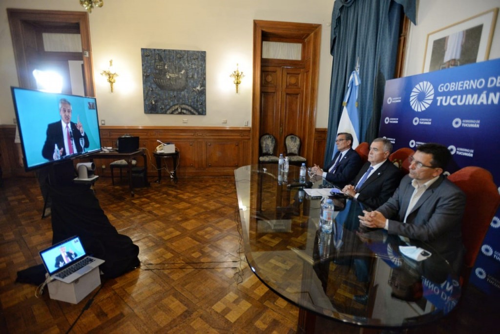 El gobernador Osvaldo Jaldo, acompañado de los ministros Álvaro Simón Padrós de Producción, Gabriel Yedlin de Desarrollo Social, a través de videoconferencia, participaron junto al Presidente Alberto Fernández, de la presentación del proyecto de Fomento al Desarrollo Agroindustrial, en el marco del Consejo Económico y Social, de la que formaron parte, la vicepresidenta Cristina Fernández de Kirchner, el jefe de Gabinete Juan Manzur y el ministro de Agricultura, Ganadería y Pesca, Julian Dominguez.