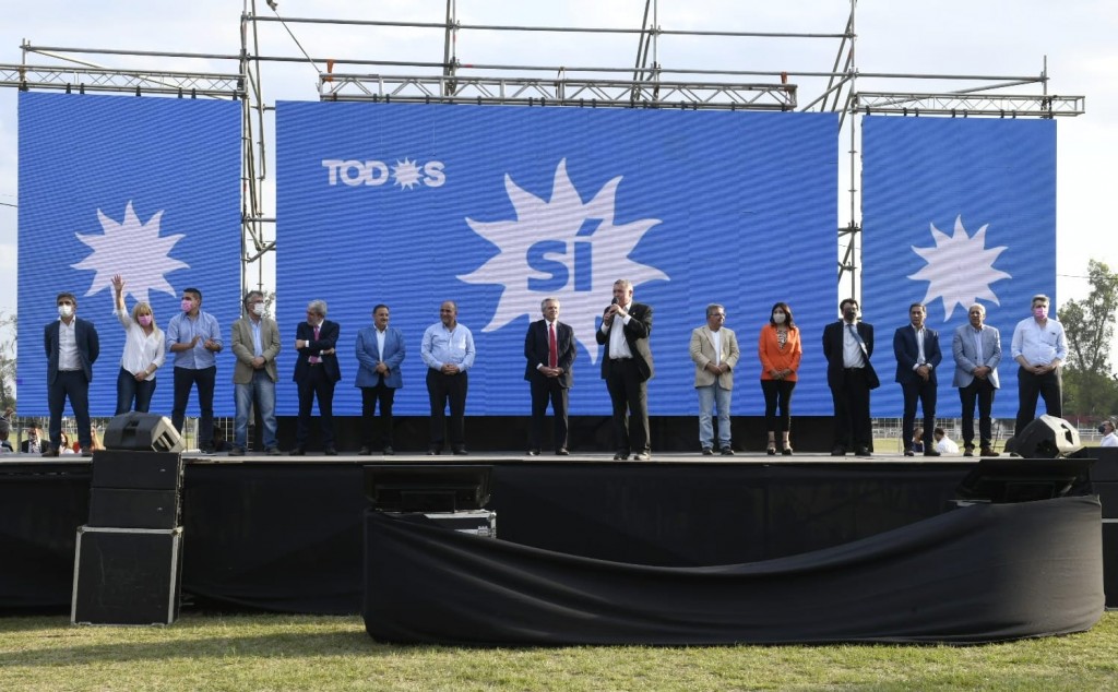 El gobernador Osvaldo Jaldo, junto al presidente Alberto Fernández, el jefe de gabinete Juan Manzur, encabezaron el multitudinario acto en el Hipódromo de Tucumán, ante más de 40000 personas que se dieron cita para escuchar al primer mandatario, del que participaron, el ministro de defensa, Anibal Fernández, de trabajo Claudio Moroni, Julio Vitobello secretario general de la presidencia, los gobernadores de Salta Gustavo Saenz, de Catamarca Raul Jalil, Ricardo Quintela de La Rioja, el vicegobernador de Santiago del Estero Carlos Silva Neder, el senador Emilio Silva Neder, los candidatos a senadores y diputados del Frente de Todos, Rossana Chahla, Agustín Fernández, Pablo Yedlin, Sandra Mendoza; los ministros del gabinete provincial, legisladores provinciales, intendentes, concejales, comisionados comunales, Madres de Plaza de Mayo, funcionarios y dirigentes, sindicales y gremiales.