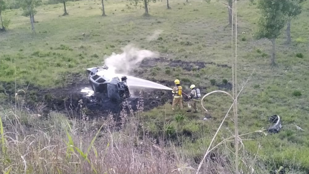 El conductor perdió control del vehículo y cayó desde la autopista hacia la banquina, donde luego se prendió fuego. Se sospecha que habría intentado esquivar a un perro, ya que a casi 100 metros hay un animal muerto y una huella de frenada.
