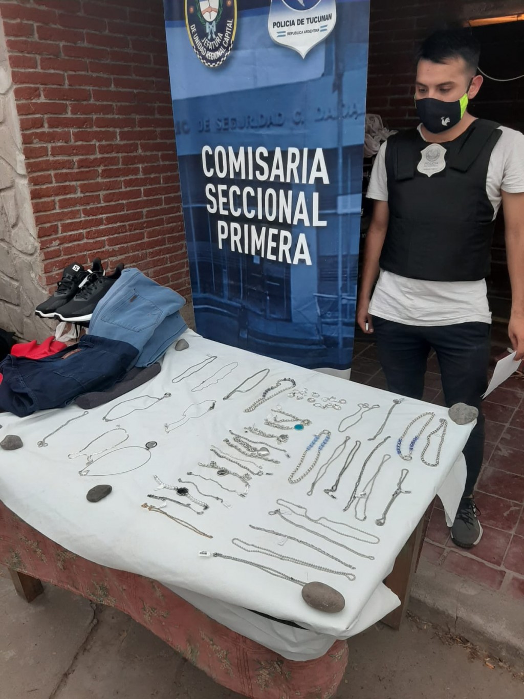 Los familiares de “El gordo re piola” hicieron entrega de unas bolsas que contenían en su interior: una docena de anillos con piedra; 24 cadenas; 13 pulseras; una caja con un par de zapatillas, que a su vez contiene un ticket de un local de indumentaria deportiva por la suma de $15.000; dos bermudas; y una chomba. Estos últimos, bienes que el imputado compró tras cometer el robo.