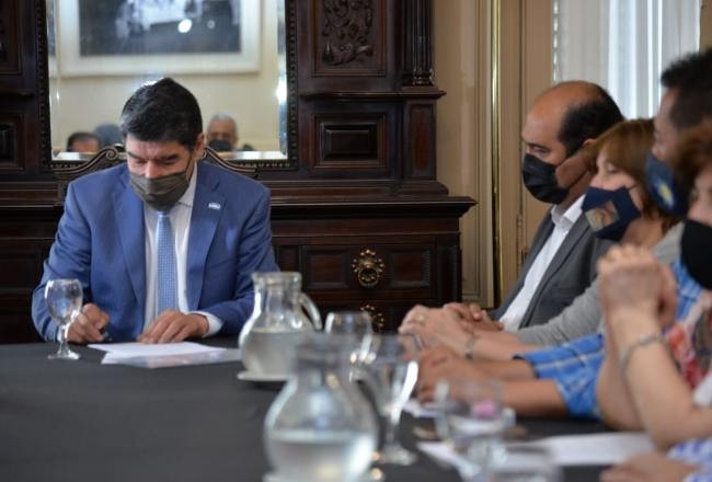 El ministro del Interior, Miguel Acevedo, encabezó este viernes en el Salón Comedor de Casa de Gobierno, la firma de convenio en el marco del programa Argentina Hace por el desembolso de fondos para la construcción de playones deportivos y pavimentación de calles en 10 comunas y dos municipios.
