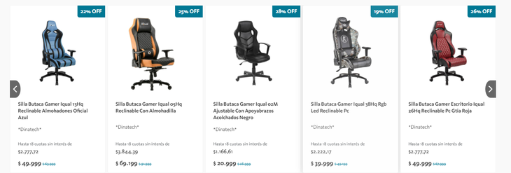 Los precios varían desde los $30.000 hasta $110.0000. Para le caso de las sillas gammer, los precios comienzan desde los $30.000 con descuentos de hasta el 30%.