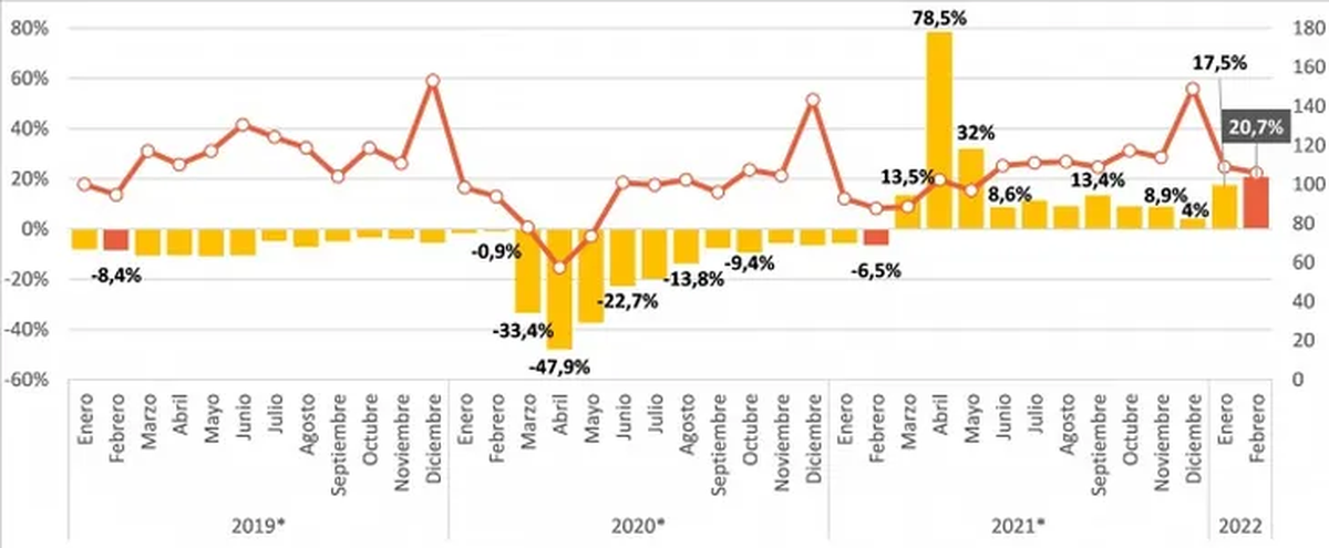 - En los primeros 2 meses del año, las ventas acumularon un alza de 19,1% frente a iguales meses de 2021 y de 11,8% si se compara con el primer bimestre de 2020.