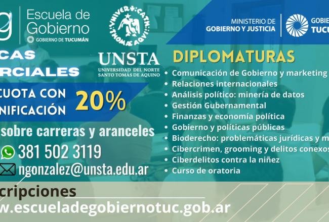 En virtud del convenio entre la Escuela de Gobierno de la Provincia y la Universidad del Norte Santo Tomás de Aquino las inscripciones estarán abiertas hasta el 06 de mayo.