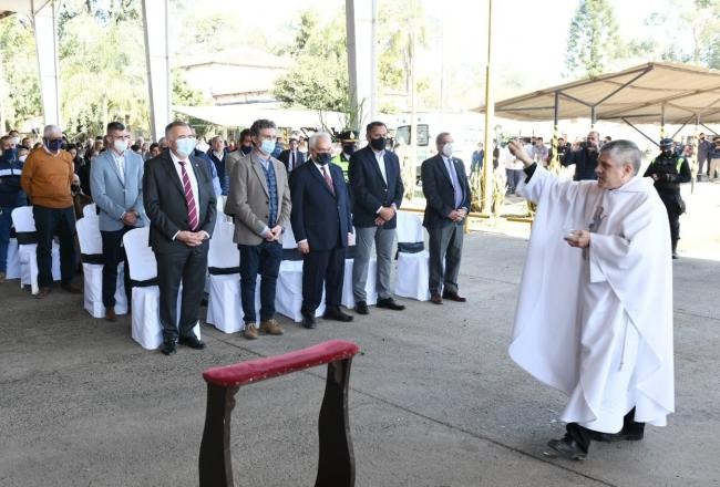 Junto al mandatario, estuvo el vicepresidente primero de la Legislatura, Regino Amado; el ministro de Desarrollo Productivo, Álvaro Simón Padrós; los empresarios, Sebastián y José Budeguer, miembros del directorio del Grupo Budeguer; el comisionado comunal de Quilmes y Los Sueldos, Roque Argañaráz; y el padre Álvaro Sánchez Rueda que ofició una misa.