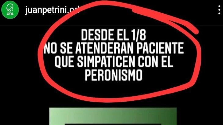 Petrini posteó en su cuenta de Instagram (@juanpetrini.orl) “desde el 1/8 no se atenderán pacientes que simpaticen con el peronismo” y lo basó en sus “nuevas políticas para poder seguir sustentando el consultorio”.