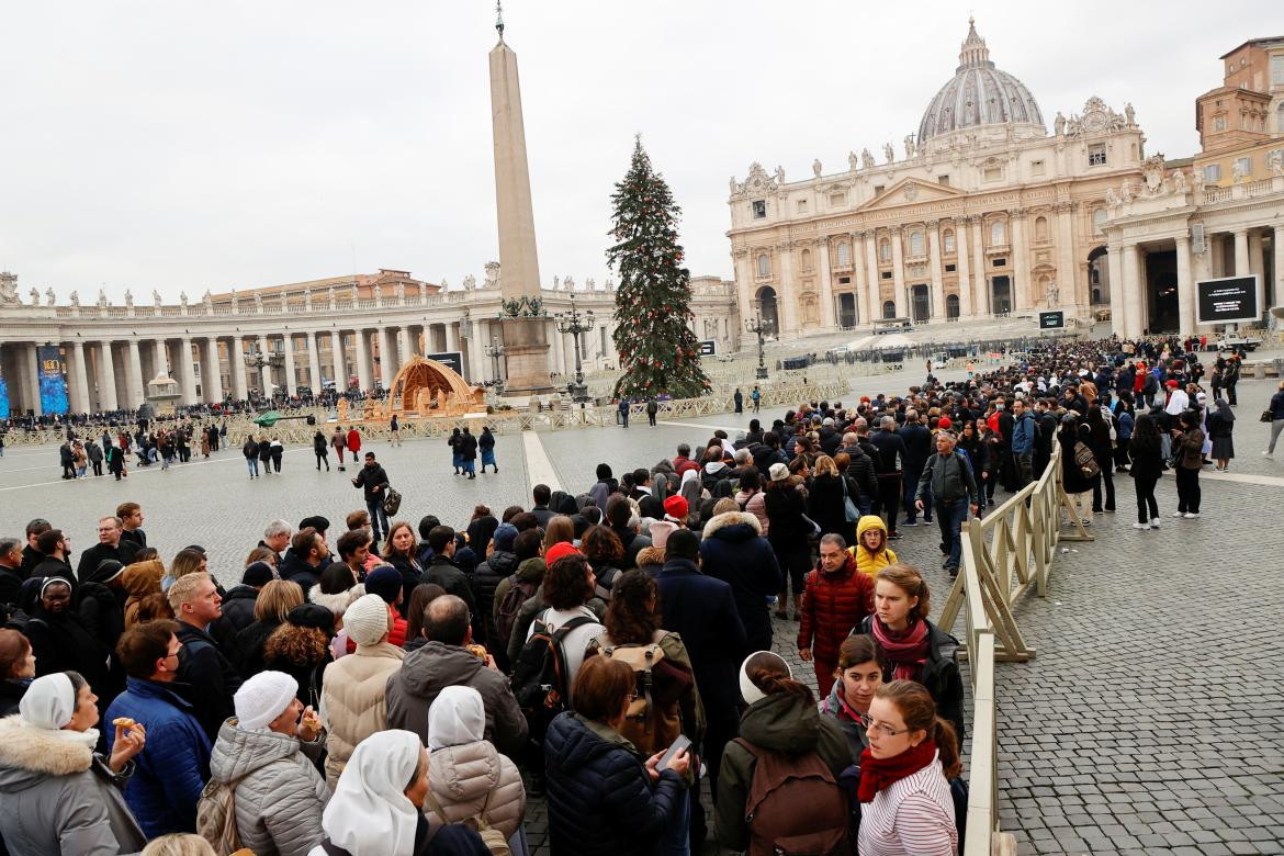 El primer grupo de fieles en entrar a la Basílica fueron estudiantes de teología que llegaron a primeras horas de la mañana a la Plaza San Pedro. A la hora de apertura, la fila para ingresar ya tenía cientos de metros y las autoridades locales esperan unos 35.000 fieles al día.
