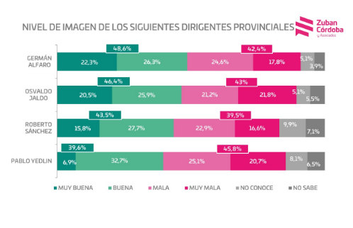 La encuesta le atribuye a Alfaro un 48,6% de imagen positiva (22,3% muy buena + 26,3% buena) contra un 43,5% de Sánchez (15,8% y 27,7% respectivamente), que también mide entre los dirigentes provinciales al periodista Omar Nóblega, y le atribuye una imagen positiva del 34,6% tras las versiones de que podría ser el candidato a intendente de su compadre Alfaro, que fuera desmentida por el propio conductor de Los Primeros. A nivel provincial, el estudio pregunta '¿quién le gustaría que sea electo como gobernador?'. Las respuestas fueron: Osvaldo Jaldo 27,2%, Germán Alfaro 23,1%, Roberto Sánchez 12,4%, Ricardo Bussi 5%.