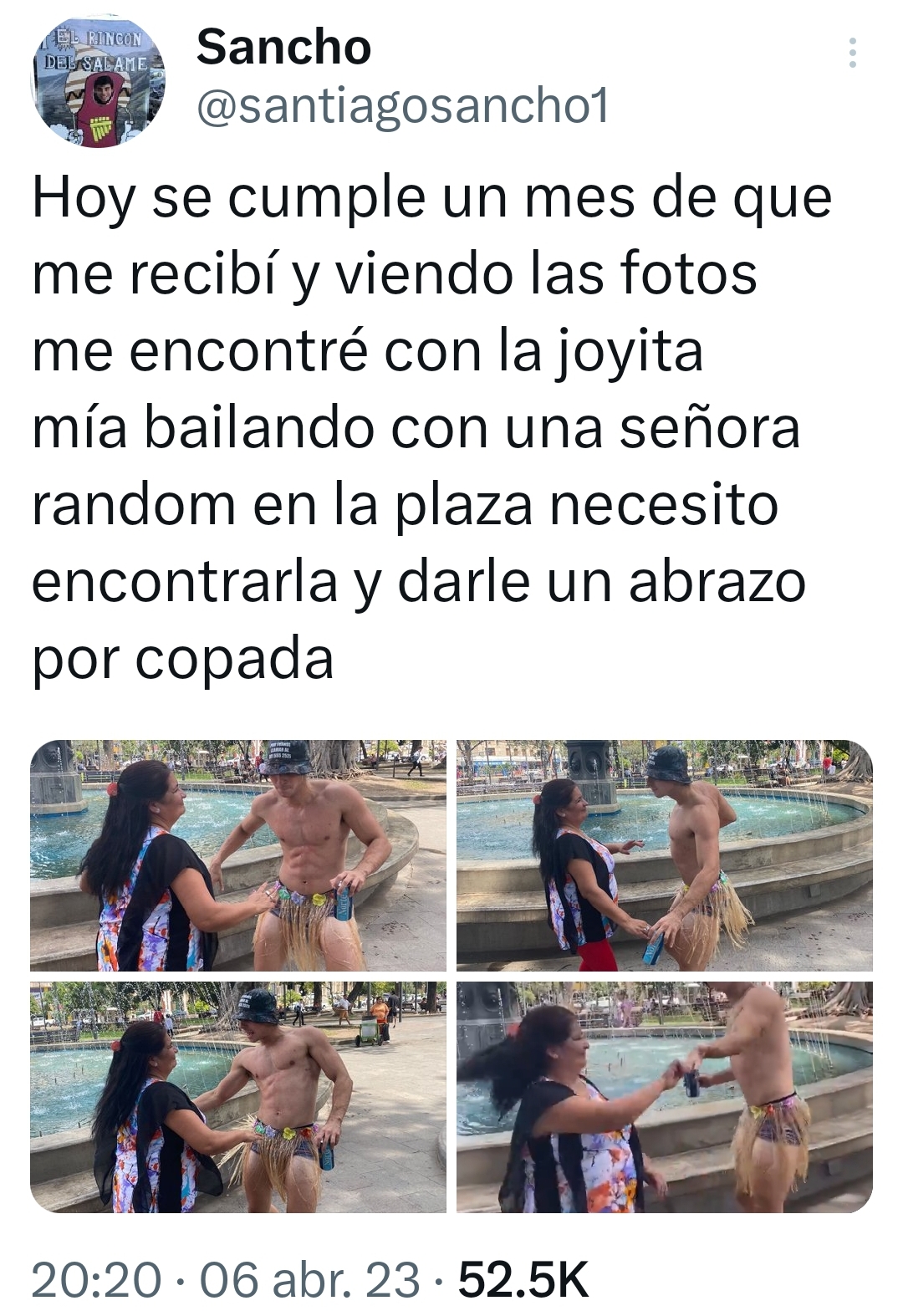 "Hoy se cumple un mes desde que me gradué y viendo las fotos me encontré con mi joya bailando con una mujer al azar en la plaza. Necesito encontrarla y darle un abrazo por ser tan copada", escribió Santiago en su cuenta de Twitter junto con las fotos y el video.