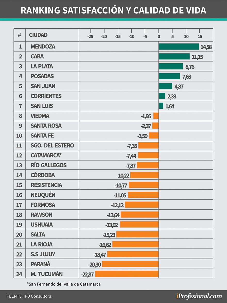 Un reciente estudio de IPD Consultora sobre la calidad de vida en las 24 capitales provinciales y la Ciudad de Buenos Aires demostró que la preferida de la mayoría como destino para irse a vivir es Córdoba, aunque la que demuestra tener mejor calidad de vida es Mendoza.