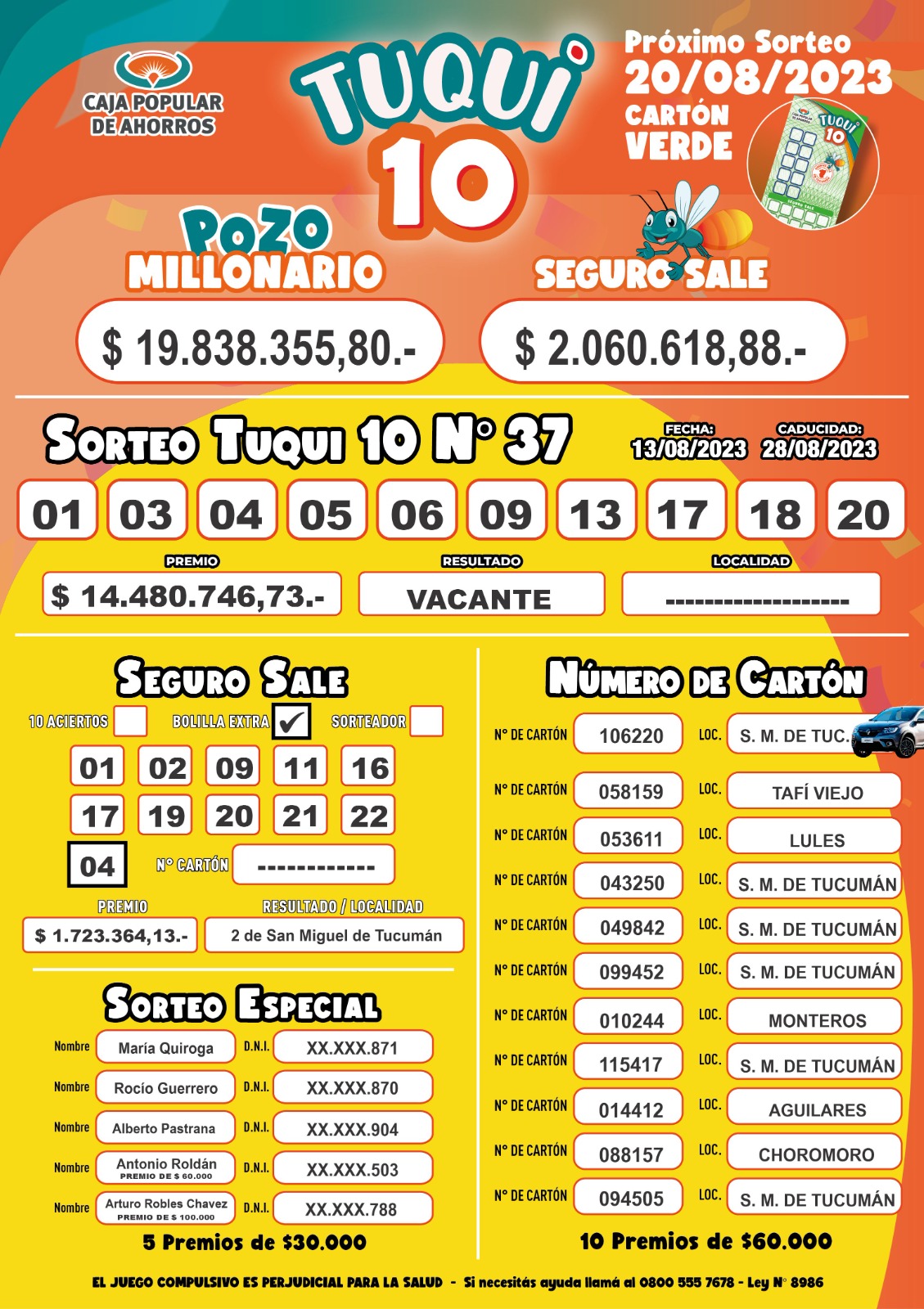 El Tuqui 10 este 13 de agosto en el sorteo N° 37, que se transmitió en vivo y en directo por la señal de Canal 10 de Tucumán con un pozo de más de 14 millones. El pozo quedó vacante y para el domingo 20 el pozo será de casi 20 millones de pesos