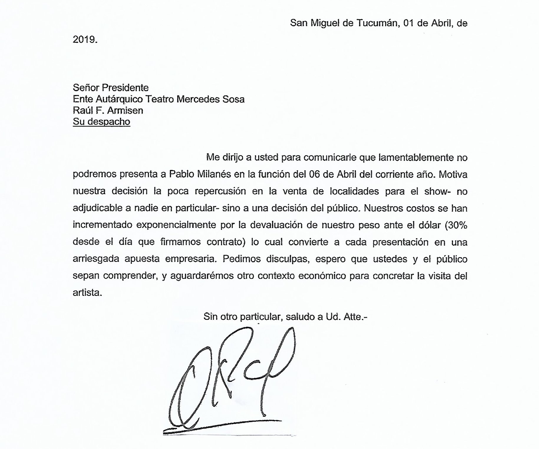 Desde el Ente Autárquico Teatro Mercedes Sosa comunicaron la suspensión del show del cantautor cubano Pablo Milanés, que iba a tener lugar el próximo 6 de abril. De acuerdo a un comunicado firmado por el presidente del ente, Raúl Armisén, la cancelación se debió a la “poca repercusión en la venta de localidades para el show –no adjudicable a nadie en particular- sino a una decisión del público”.