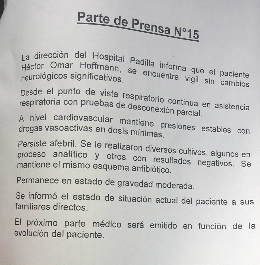 Federico Hoffmann, hijo del cantante, escribió en Twitter un mensaje criticando a los que difundieron las versiones falsas sobre la salud de su padre. "Escuchen con atención. Cambien de canal si se nubla la señal, no es el enchufe. Son impertinentes tirando humo. ¡Ojos bien abiertos! Aquí el parte médico del día de hoy", anunció el Federico adjuntando el parte médico.