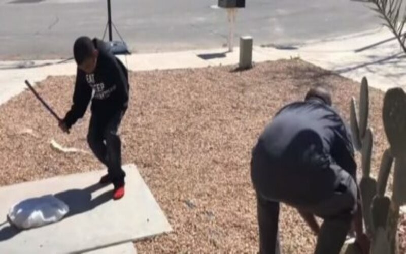 También pidió a su hijo hacer lo mismo, pero cómo la roca es muy grande, Tre la volvió a arrojar contra el aparato sin tentarse el corazón por el llanto del pequeño.