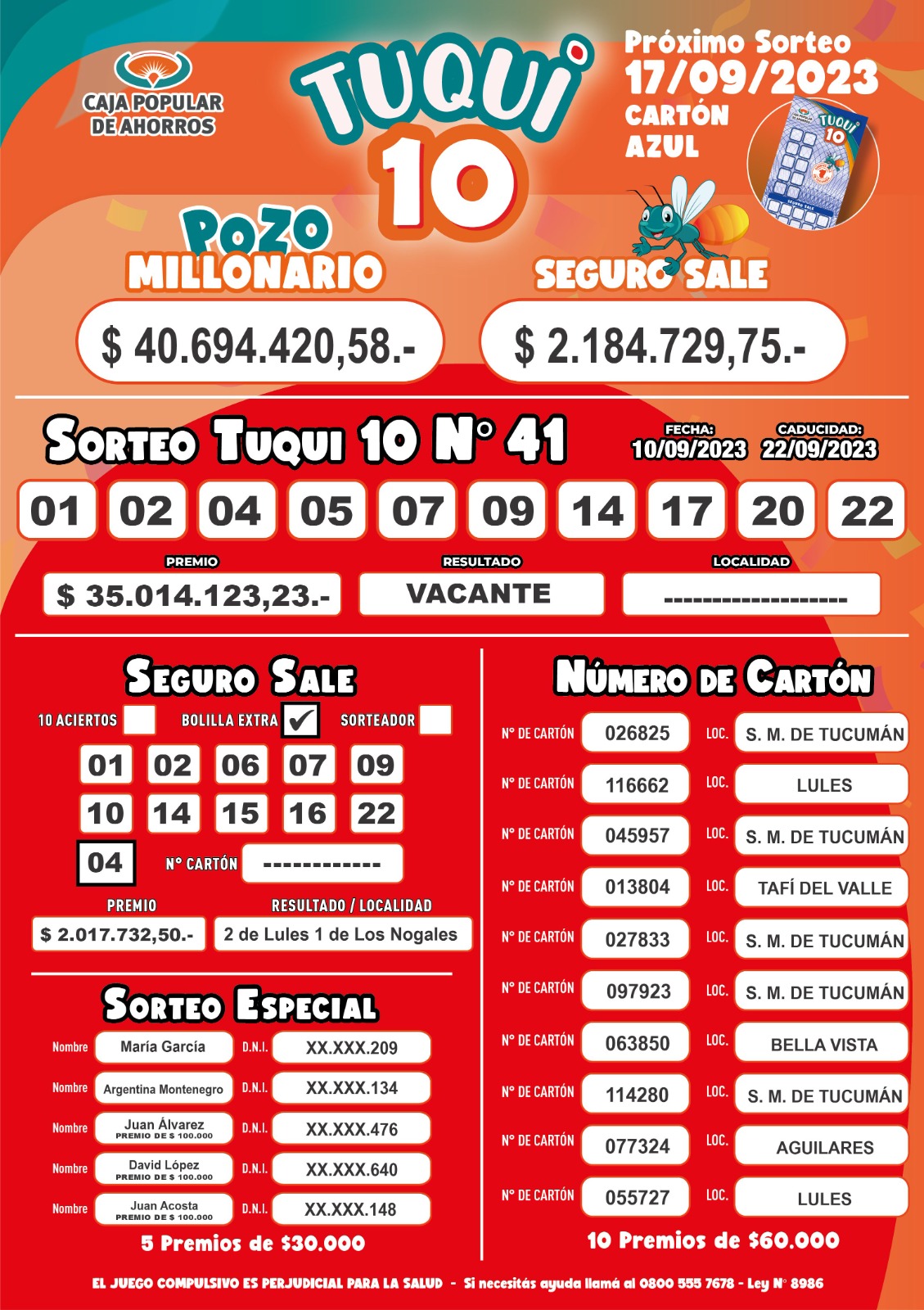 La categoría Seguro Sale tuvo un monto de $2.017.732. Además los 10 premios por Número de Cartón de $60.000. En el sorteo por cuponera podes llevarte $30.000, con la posibilidad de duplicarlos y triplicarlos si contestas el Tuqui Llamado.
