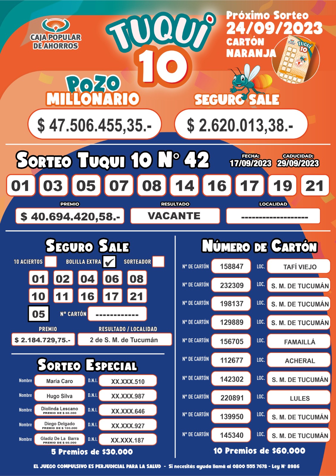 La categoría Seguro Sale tuvo un monto de $2.184.729. Además los 10 premios por Número de Cartón de $60.000. En el sorteo por cuponera podes llevarte $30.000, con la posibilidad de duplicarlos y triplicarlos si contestas el Tuqui Llamado.