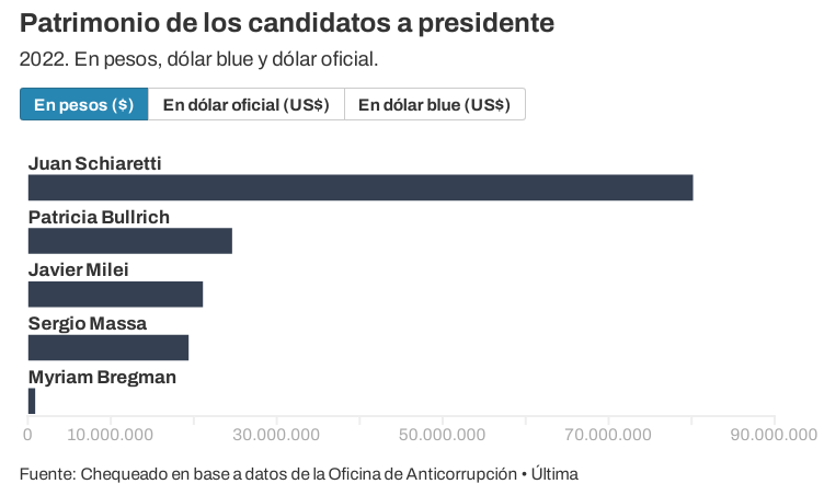 Esta semana se publicaron los documentos oficiales que dan cuenta de los patrimonios de los 5 candidatos presidenciales: Javier Milei (La Libertad Avanza), Patricia Bullrich (Juntos por el Cambio), Sergio Massa (Unión por la Patria), Juan Schiaretti (Hacemos por Nuestro País) y Myriam Bregman (Frente de Izquierda y de Trabajadores). Los datos presentados corresponden al cierre del ejercicio 2022.