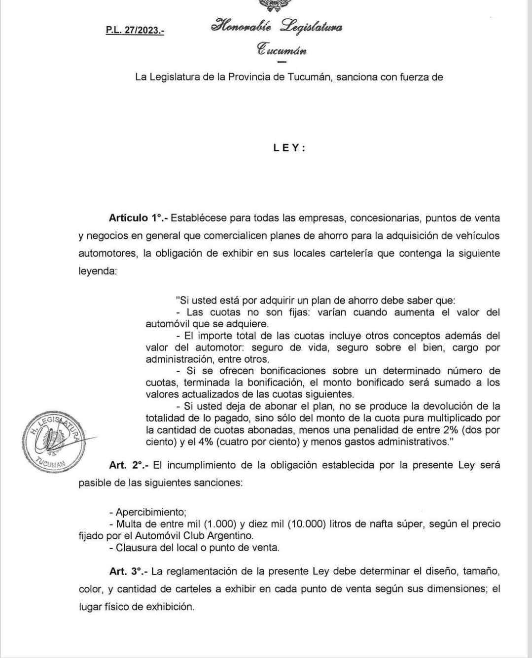 En la primera, suspende los Juicios Prendarios en contra de éstos; y en la segunda dispone que las Concesionarias y puntos de venta de Planes de Ahorro para la adquisición de vehículos automotores, deben exhibir la cartelería necesaria que informe sobre los planes ofrecidos.