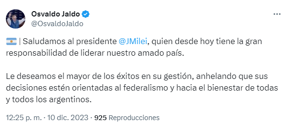 Desde Tucumán, el gobernador, Osvaldo Jaldo, lo saludo en su cuenta de X. "Saludamos al presidente @JMilei, quien desde hoy tiene la gran responsabilidad de liderar nuestro amado país", posteó el primer mandatario tucumano.
