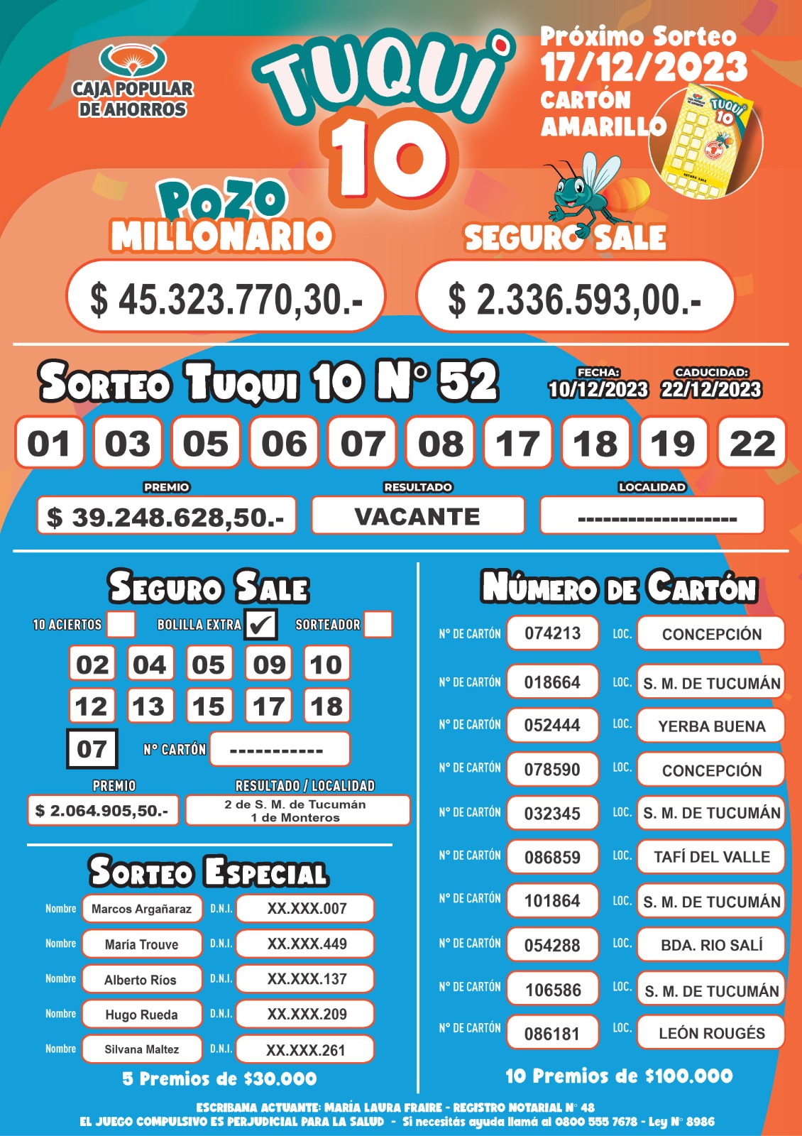 La Caja Popular de Ahorros llevó a cabo el sorteo del Tuqui 10 este domingo, el pozo quedó vacante. Qué números salieron
