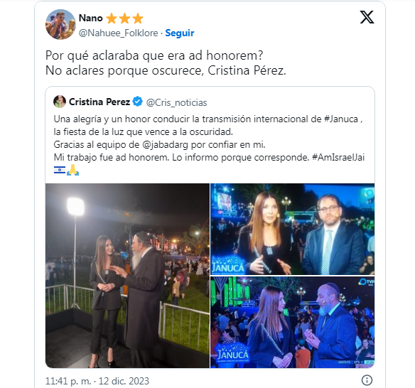 "Mañana martes desde las 20 horas conduciré la transmisión internacional de la celebración de Janucá en Av Libertador y Austria. La organización de @jabadarg ya tiene confirmado que el Presidente @jmilei encenderá una de las velas. Es la primera vez que un presidente argentino participa de esta festividad", había anunciado la periodista.