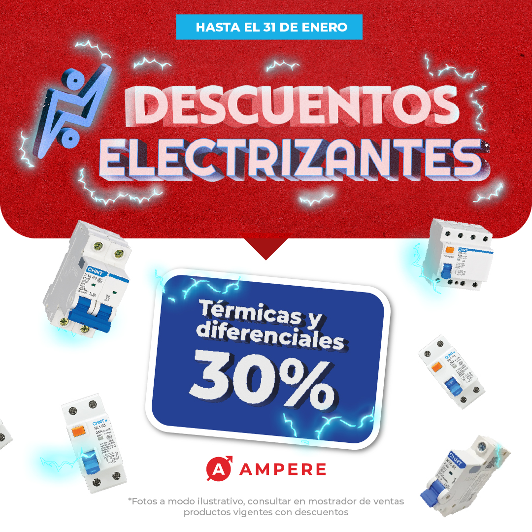 Vale reiterar las ofertas de Ampere son sobre "iluminación 35%, térmicas y diferenciales 30%, canalización 30%, llaves de luz 30% y ventilación 35%. Y desde luego también hay planes de financiación si necesita porque recibimos todas las tarjetas. Ya sea Visa Mastercard, los planes ahora 3, 6, 12 y 18. Naranja Plan Z más 25% de reintegro hoy, por ejemplo, día martes. Y después tenés con Santander Río sin interés los miércoles".
