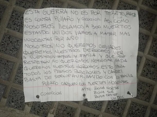 "Nosotros no queremos celulares, queremos nuestros derechos, ver a nuestros hijos y familia, y que se respeten. No queremos negociar nada. Queremos nuestros derechos para todos los presos en pabellones y cárcel. Basta de seguir humillando a la familia. Pullaro y Cococcioni carguen con la muerte de inocentes", concluye la nota, que fue firmada por "Zona Norte, Zona Sur, Zona Oeste, unidos".