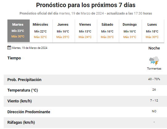 Al hablar de las posibilidades de tormentas, la página del SMN indicaba, "probabilidades de tormentas aisladas entre 40 y 70% y durante la tarde y la noche tormentas también". Sin embargo el observador expresó: "Y Jorge Noriega dice que entre las 22 y 24 se podrían dar, pero ya es muy aislado, si vos te sales ahora afuera, ves la nubosidad, pero tanto en el medio también rayos de sol, por eso se eleva la temperatura, pero es muy poco probable que se den".