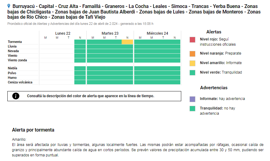 En tanto que agregó: "Hoy puede darse alguna que otra gotita aislada en algún momento del día, en distintos sectores y de variada intensidad, pero nada a comparación de lo que va a ser mañana martes, con una máxima entre 24 y 25 y una cantidad de agua caída aproximada 23 milímetros, que podría darse, hay que estar atento al sistema de alerta temprana Servicio Meteorológico Nacional, una alerta amarilla por lluvia mañana, puede ser, no hay nada todavía, no hay nada, pero por la cantidad de agua que va a caer podría darse una alerta amarilla por lluvia, porque las alertas amarillas por lluvia son entre 20 a 40 milímetros y estaríamos hablando que aproximadamente puede llegar a caer 23 mañana, que van a iniciarse entre las 2 y las 4 de la mañana, de mañana".