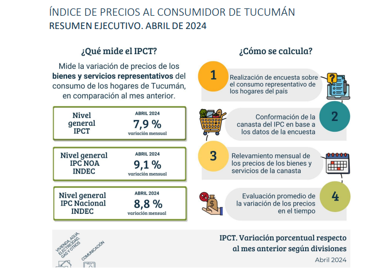 La Dirección de Estadística de la Provincia (DEP), dependiente de la Secretaría de Estado de Gestión Pública y Planeamiento, informa que la variación en el nivel general de precios, para el aglomerado Gran Tucumán y Tafí Viejo, en abril de 2024 con respecto a marzo de 2024, fue del 7,9%.