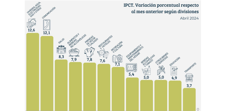 En tanto las categorías que más aumentaron fueron “Vivienda, agua, electricidad, gas y otros combustibles” (12,6%) seguida por “Comunicación” (12,1%).
