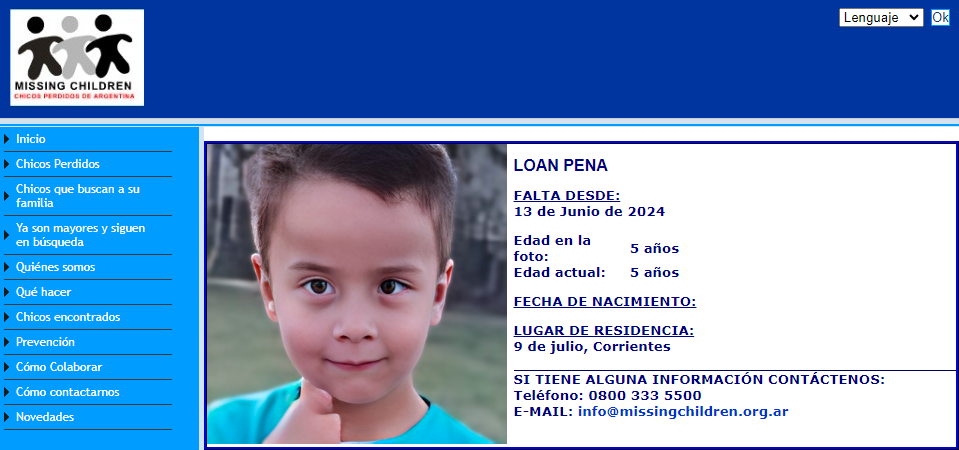 Pertierra invitó "a todos a que entren a nuestra página y a partir de ahí difundan la imagen de Loan o de los más de 100 chicos que estamos buscando actualmente". Y añadió: "Todos pueden ser voluntarios de Missing Children, los invitamos a entrar a nuestras redes Missing Children Argentina y empezar de ahí a compartir la imagen de Loan y de cualquier chico perdido y como siempre decimos, estás ayudando a una familia a encontrar a sus niños. Y nuestro teléfono de contacto es el 0800-333-5500, las 24 horas, déjanos tu mensaje si sabes de algún chico perdido o querés denunciar a un chico perdido o tenés información de alguno de los chicos que estamos buscando, lo puedes hacer de manera anónima en nuestro teléfono".