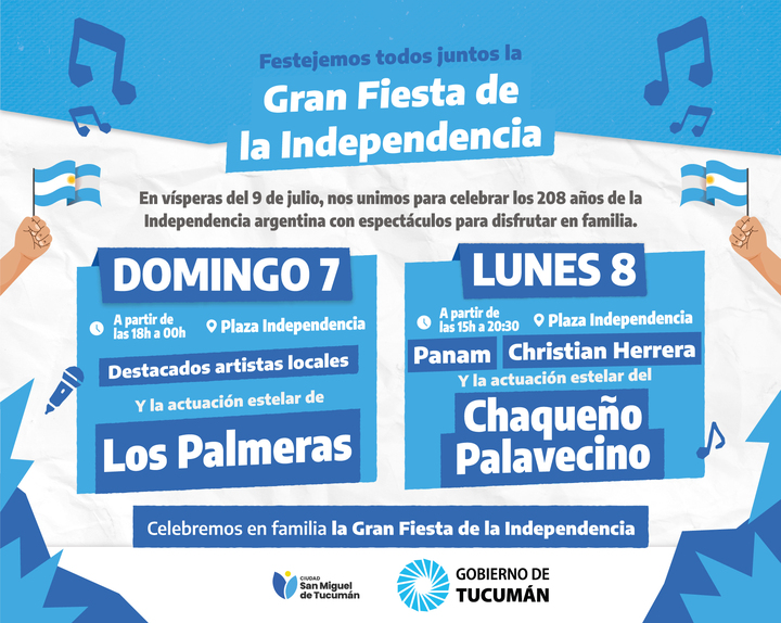 El Gobierno de Tucumán en conjunto con la Municipalidad de San Miguel de Tucumán organizaron una cartelera de lujo para los festejos por el Día de la Independencia. La fiesta se desarrollará en la explanada de Casa de Gobierno el domingo 7 y lunes 8 de julio.