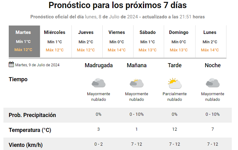 Mientras indica un pronóstico para este martes 9 de julio, con mínima de 1°, máxima de 12, identica temperaturas para el día miércoles, jueves, mínima de 2° y máxima de 12°, mientras que el viernes será de mínima 0° y la máxima de 14°.