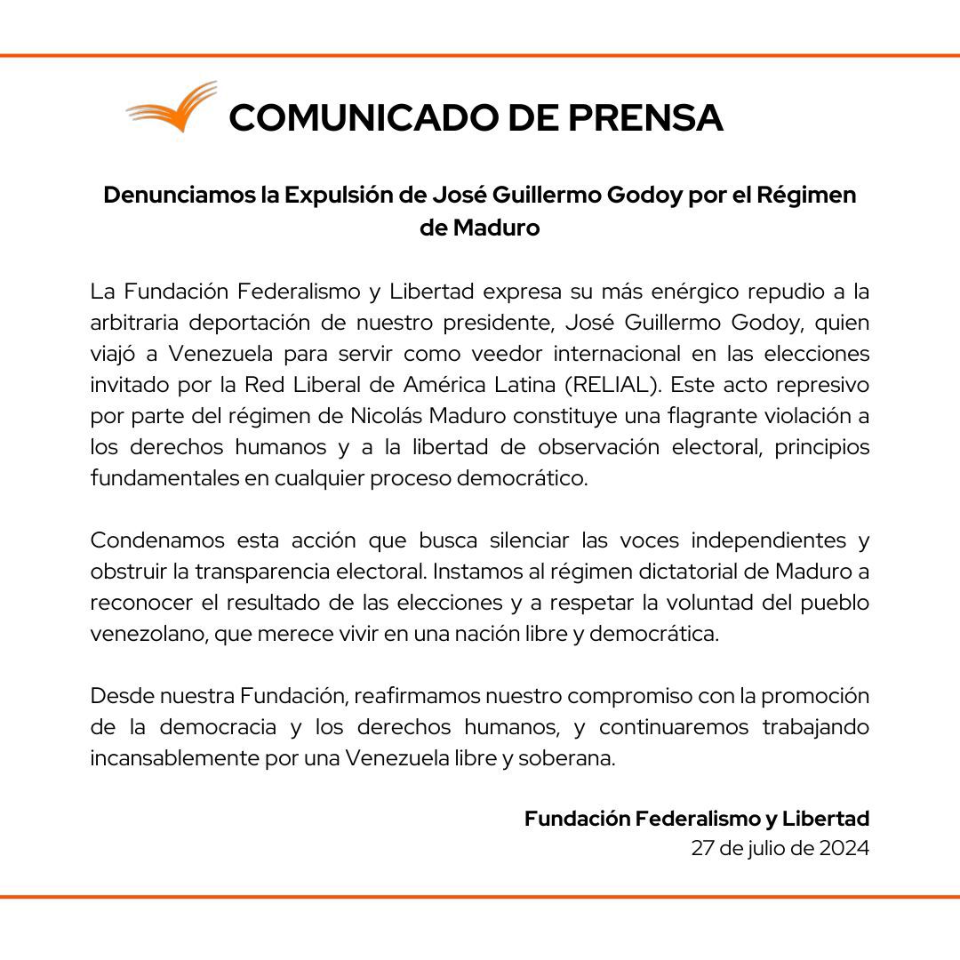 Él estaba en Venezuela para ser veedor de las elección que se desarrollaron en ese país este domingo, sin embargo, fue expulsado. Por esto desde la Fundación Federalismo y Libertad emitieron, un comunicado en el "expresa su más enérgico repudio a la arbitraria deportación de nuestro presidente, José Guillermo Godoy, quien viajó a Venezuela para servir como veedor internacional en las elecciones invitado por la Red Liberal de América Latina (RELIAL). Este acto represivo por parte del régimen de Nicolás Maduro constituye una flagrante violación a los derechos humanos y a la libertad de observación electoral, principios fundamentales en cualquier proceso democrático".