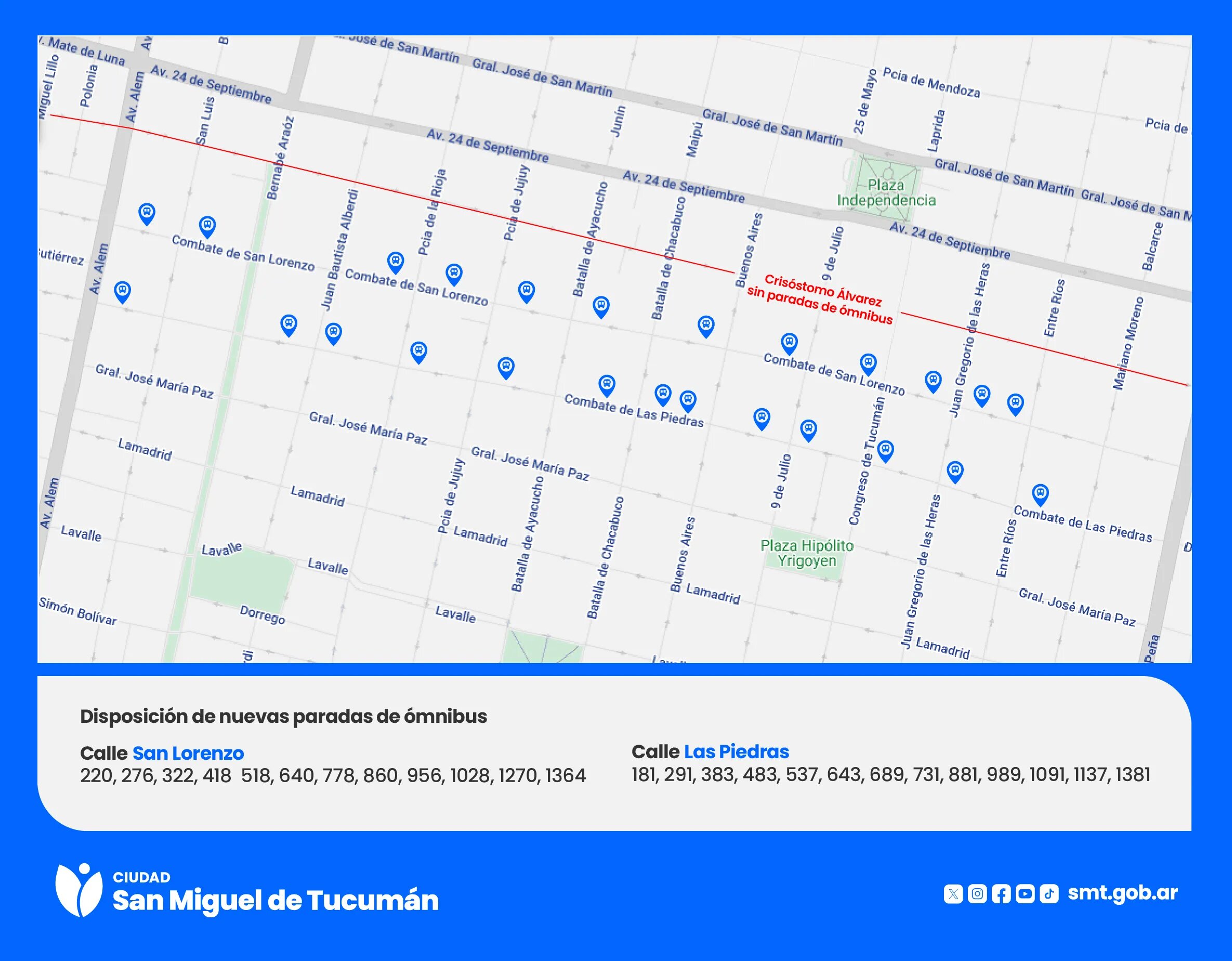 La medida, que forma parte del Plan Integral de Movilidad Urbana (PIMU) diseñado por la Municipalidad de San Miguel de Tucumán para reordenar el tránsito vehicular en la ciudad, incluirá modificaciones en las paradas de las líneas de ómnibus que hoy circulan por ambas arterias. En este sentido, todas las unidades del transporte de pasajeros que hoy circulan de oeste a este por calle Crisóstomo Álvarez, desde los primeros minutos del viernes tendrán sus paradas en calle San Lorenzo; mientras que los colectivos que suben por San Lorenzo desde ese día lo harán por calle Las Piedras.