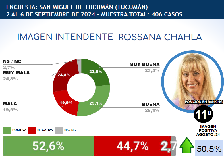 Mientras la intendenta de San Miguel de Tucumán, Rossana Chahla, escaló dos posiciones y quedó en el puesto 11 del ranking de jefe municipales, con un 52,6% de imagen positiva.