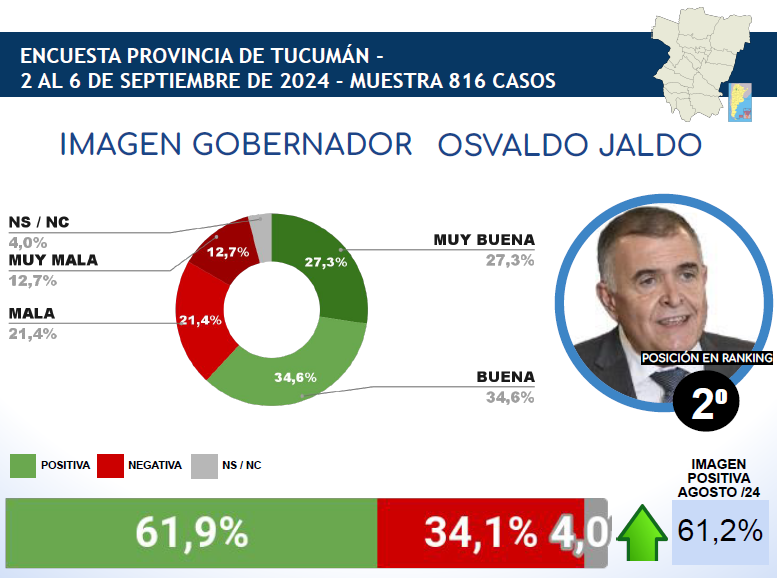- 2) Osvaldo Jaldo (Tucumán): + 61,9%, 4% ns/nc, - 34,1%.