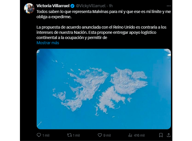 "Todos saben lo que representa Malvinas para mí y que ese es mi límite y me obliga a expedirme. La propuesta de acuerdo anunciada con el Reino Unido es contraria a los intereses de nuestra Nación", señaló la titular del Senado a través de una publicación en sus redes sociales.