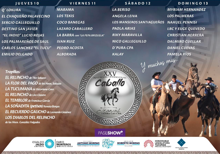 La edición XXV de este tradicional evento presenta un programa destacado que se desarrollará durante cuatro días. La doma y la destreza criolla serán protagonistas del espectáculo, donde más de 50 jinetes competirán en categorías como crina limpia, basto con encimera y gurupa. El festival comenzará con una representación de la "Batalla de Tucumán", que incluirá a más de 2.500 bailarines y 40 jinetes a caballo.