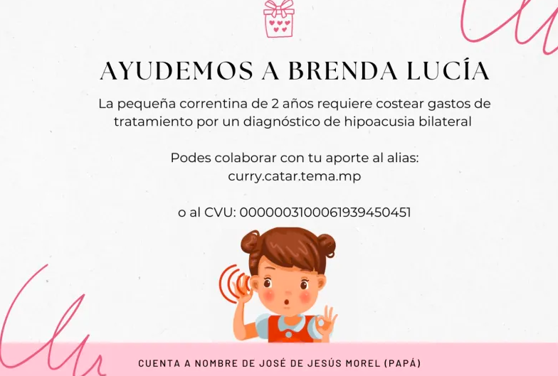 Para que la comunidad pueda ayudarlos a llevar adelante el tratamiento de la pequeña Brenda Lucía, habilitaron una cuenta cuyo alias es curry.catar.tema.mp o al CVU 0000003100061939450451 (cuentas a nombre de José de Jesús Morel, su papá) Cualquier monto, por ínfimo que sea, será de gran valor para la familia. Muchas gracias.