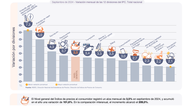 El Instituto Nacional de Estadísticas y Censos (INDEC) reveló que la inflación de septiembre fue 3,5%, mientras que el acumulado interanual se ubica en un 209%. En tanto, en los primeros nueve meses del año, el Índice de Precios al Consumidor (IPC) alcanza un alza de 101,6%.